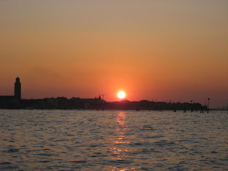 After a 14 hour flight, the boat ride was relaxing. Venice harbor with a beautiful sunset as a backdrop can mesmerize and excite you at the same time. Boat traffic was light except for a monstrous cruise ship heading out to sea which looked out of place near this old city. The setting sun highlighted the lagoons natural beauty and made the water taxi ride into Venice much more memorable. It was dark by the time we arrived at San Marcos and started looking for our hotel.